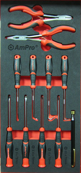 Приобрести T28743 Набор инструмента (отвертки,крючки,плоскогубцы,магнит) 11 предметов в мягком ложементе от компании AmPro (Тайвань) из раздела Ложементы мягкие (VA серия)