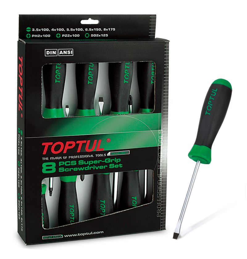 Приобрести Набор отверток (PH, PZ, SL, SQ), 8 предметов в картоне TOPTUL от компании Toptul (Тайвань) из раздела Наборы отверток по цене 2 990 рублей.